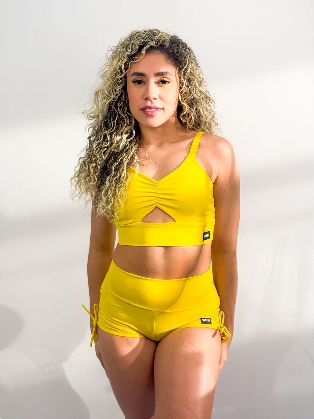 O Conjunto Maju é inspirado na campanha Setembro Amarelo, trazendo um design vibrante em amarelo que simboliza a valorização da vida. Composto por top de alça e short, oferece conforto e estilo para o dia a dia ou treinos leves. O tecido leve proporciona ótima respirabilidade e liberdade de movimento.
